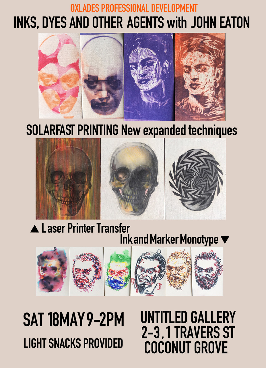 Come along to a full day workshop where we will explore some Oxlades products with John Eaton: 1. A recap and extension on Solarfast dye, a replacement for previous product known as Inkodye (Amongst other techniques I now make acetate negatives in the class with students with a variety of tools that circumvent the need for a photocopier) 2. A drawing transfer with water-soluble markers (includes some contemporary mark making practises) and other media. 3. A photocopy transfer and layering…